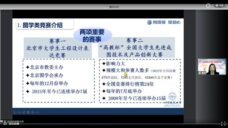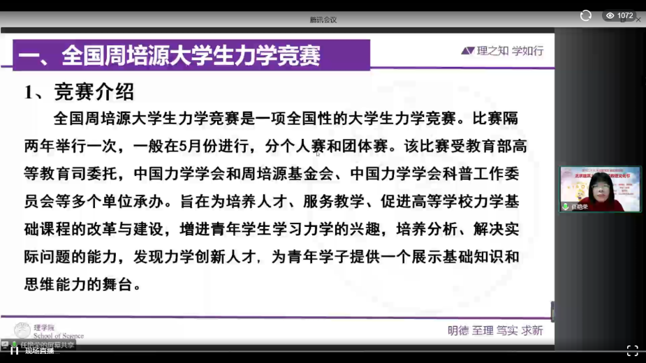 任艳荣老师对全国周培源大学生力学竞赛、京南大学联盟力学竞赛和“力创杯”北京建筑大学力学竞赛的竞赛时间、举办单位、参赛方式等进行了说明。