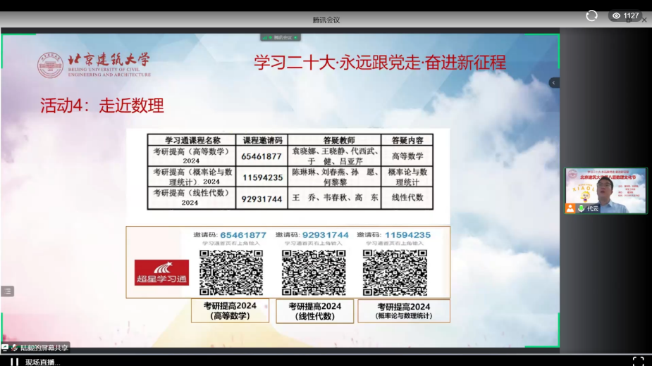 接下来,代云介绍了第八届数理文化节的4项主题活动。红色数理——通过线上征文/宣讲/故事分享等形式,开展对华罗庚、陈景润等为国家作出重要贡献的数学家们学习。趣味数理——通过数独和魔方这两个经典的数学思维游戏比拼的方式,在趣味活动中感受数理魅力。魅力数理——通过线上笔记/视频/文字等自己喜欢的方式展现自己的解题思路与思考方式。走近数理——发布了2024年考研数学课程《高等数学》、《概率论与数理统计》和《线性代数》在学习通平台的辅导答疑邀请码。