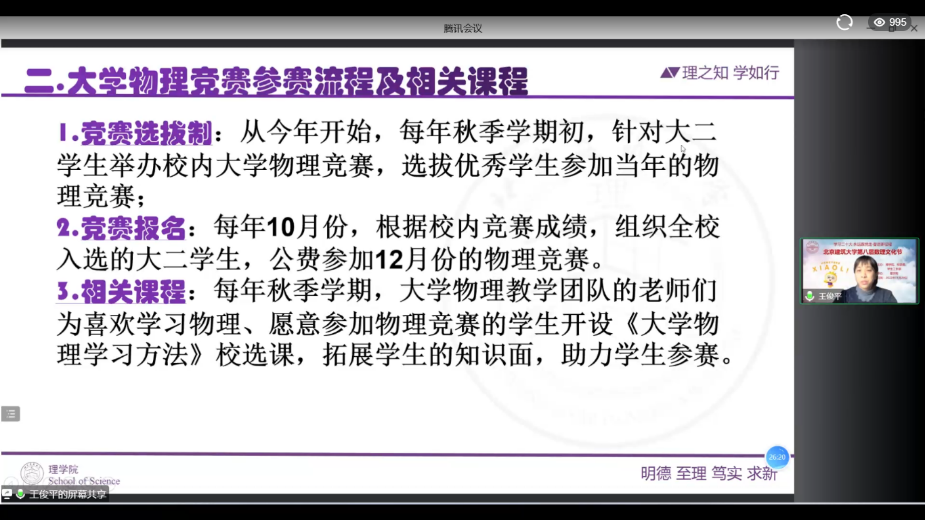 王俊平老师说明了全国部分地区大学生物理竞赛的参赛流程,送上了对同学们的期望和寄语等。