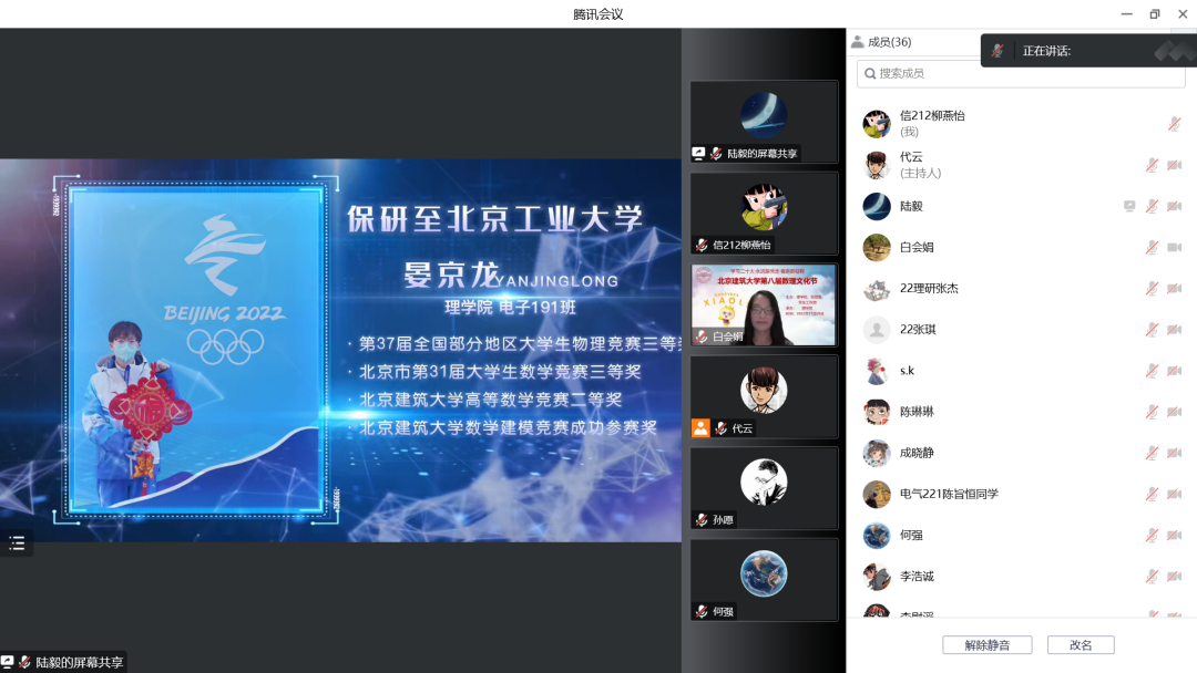 与会师生共同观看了我校2022年获得推免研究生资格的部分学生在大学期间参加的数学、物理、力学、图学等基础学科竞赛的获奖展示视频,这些学生在学科竞赛中取得的优异成绩充分表明了基础学科竞赛对人才培养的重要支撑作用。