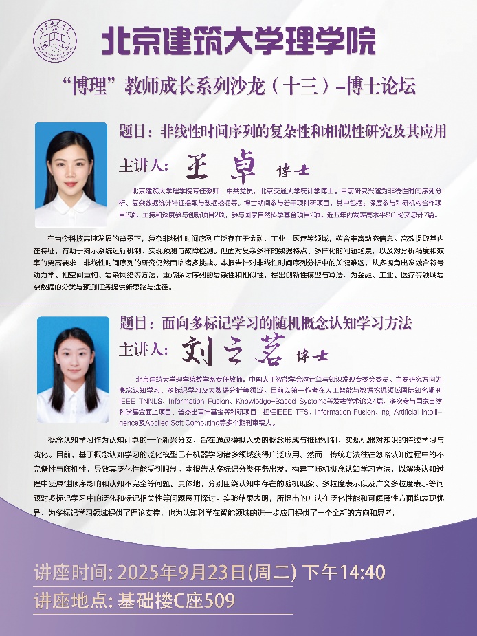 本次论坛活动由副院长刘茂省主持,活动邀请了两位新入职的教师王卓和刘之茗进行报告。首先,王卓博士以“黎曼几何理论在复杂非线性时间序列分析中的应用”为主题,介绍了基于仿射不变黎曼度量的时间不可逆性指标(TIAIRM)和基于序数网络的仿射不变黎曼度量指标(ONAIRM),用于序列特征提取和相似性度量,并分享了其在工业制造与医疗诊断中的应用案例。随后,刘之茗博士以“面向多标记分类的随机概念认知学习方法”为主题,介绍了概念认知学习的研究背景,同时面向多标记分类问题,以认知中存在的随机性为切入点,围绕认知中信息的多粒度表示以及广义多粒度表示等问题对多标记学习中的泛化和标记相关性等问题展开了探讨,最后实验结果展示了所提模型的有效性。