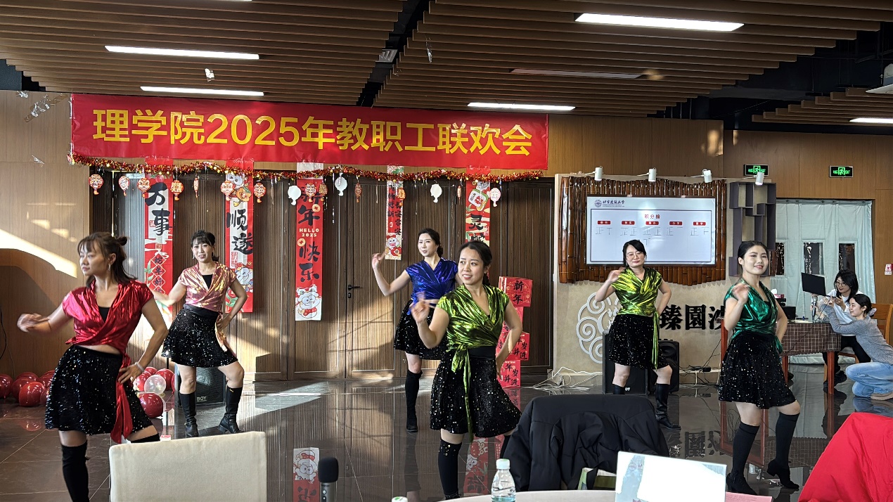 第三篇章,窦轶洋、郑环环、陈琳琳、郑娇、张聪晖6位老师带来精彩舞蹈表演《姐就是女王》,更是动感十足、活力满满、激情四射把联欢会现场的气氛燃爆到了极点。力学系教师们给大家倾情呈现歌曲《歌唱祖国》,台下的观众们一起高声同场,激昂的旋律不停地回荡在臻园三层,表达每一位教职工对祖国的深厚情感和祝愿。