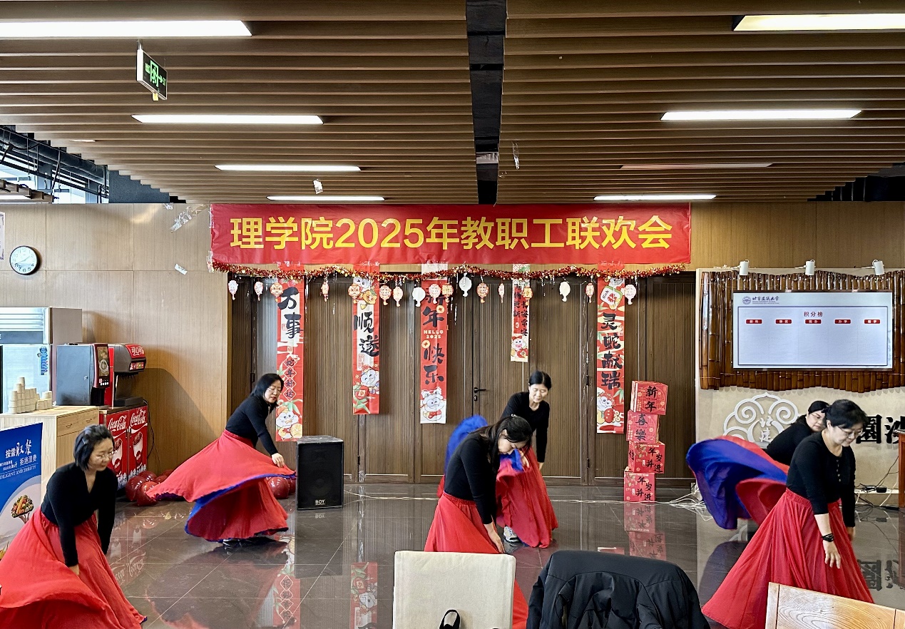 随后联欢会在由吴尚文、王晓静、张艳、徐瑞洁,石萍,袁晓娜等6位老师表演的开场舞《如意》中拉开序幕,这几位老师绚烂多姿、翩若惊鸿的曼妙舞姿引起了台下广大教职的声声喝彩和阵阵掌声。物理系教师带来的歌曲《大中国》把现场气氛推向新的高潮。
